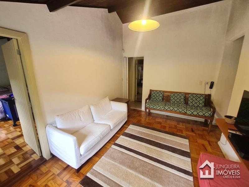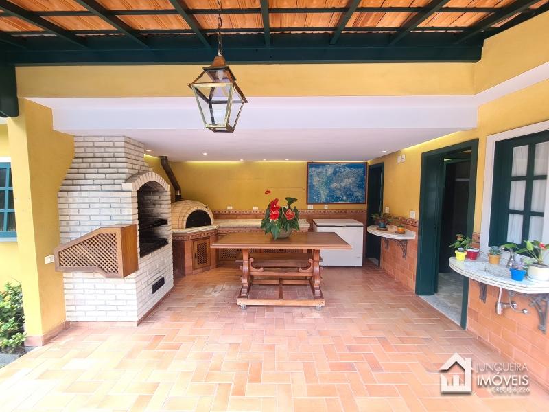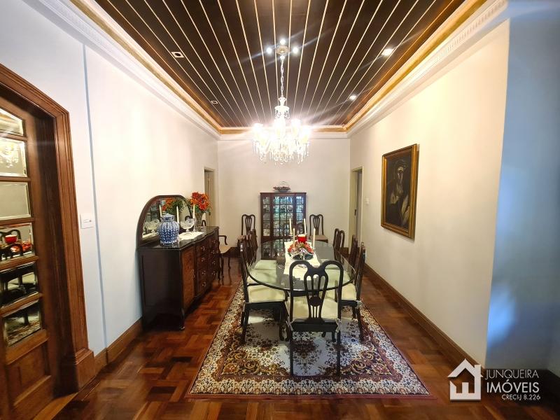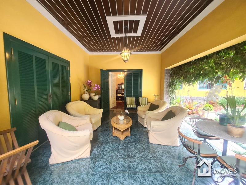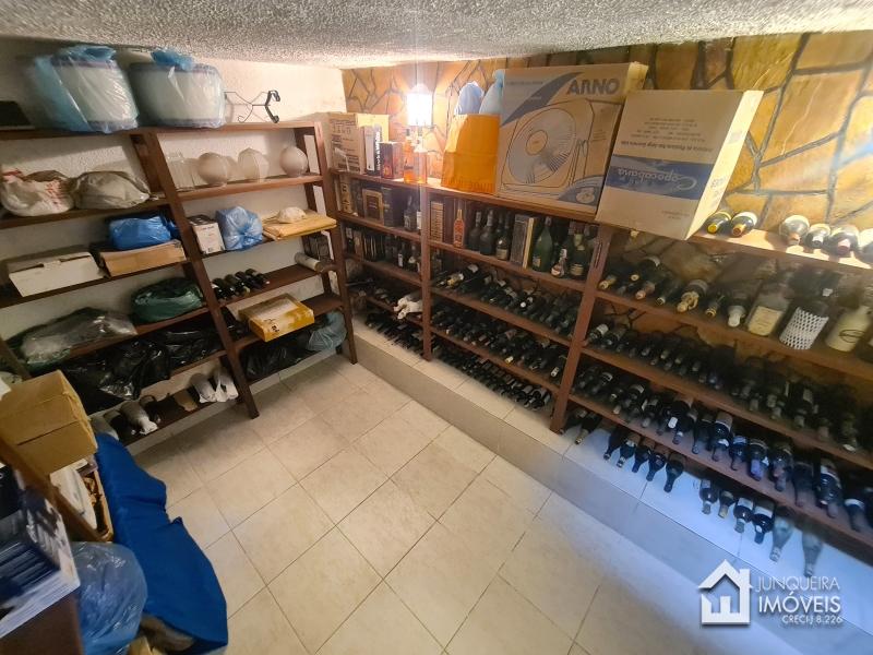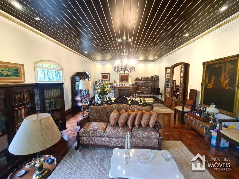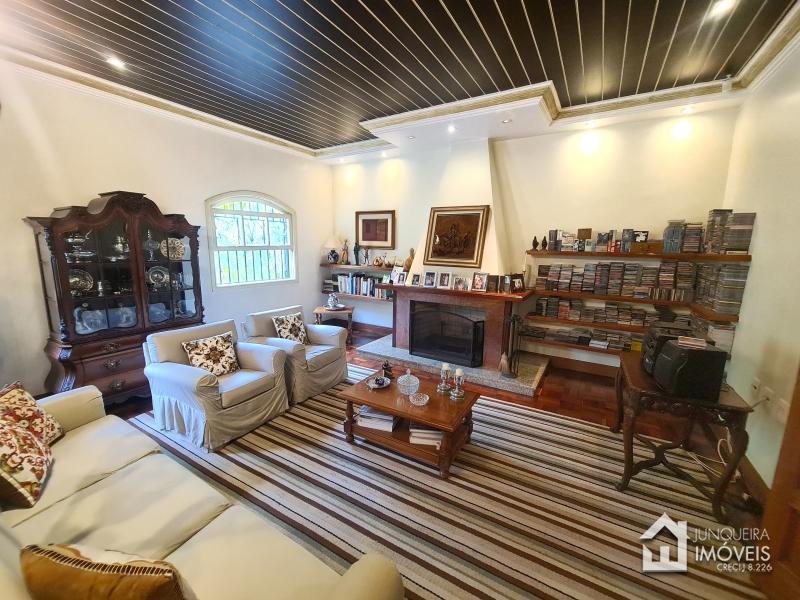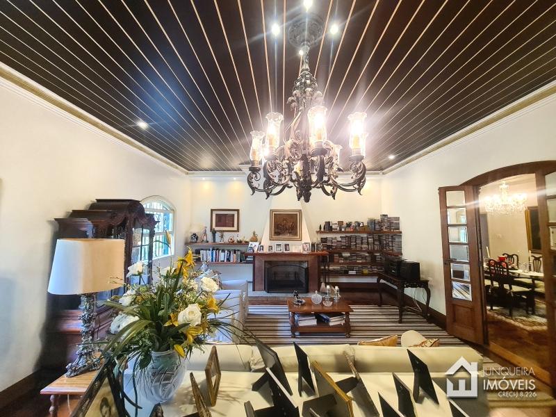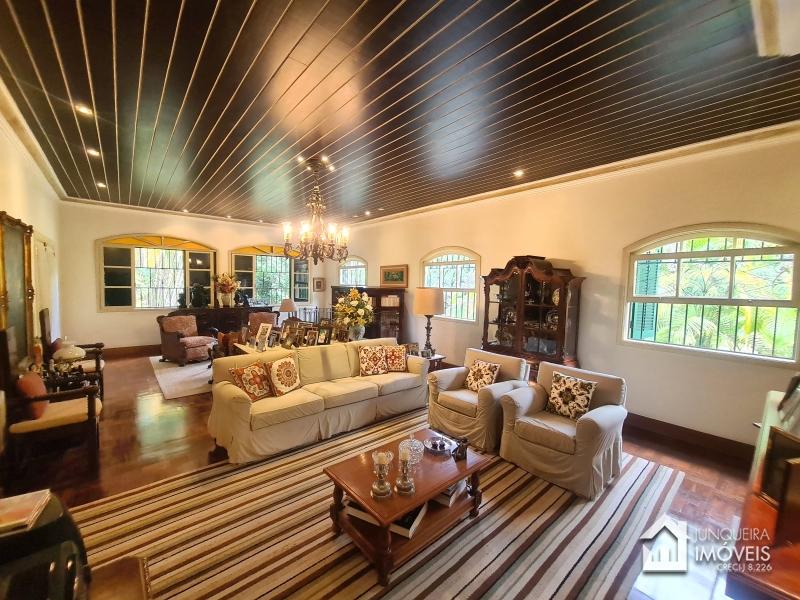De frente à área de lazer, e de forma totalmente linear, temos a casa principal, com uma confortável varanda, plenamente integrada com a ampla sala de estar em 2 ambientes, com lareira, além da sala de jantar, todas com impecável piso em taco de peroba e belas sancas no teto de madeira, decorando de forma elegante os cômodos. A porta balcão da sala de estar para a sala de jantar é decorada com cristais bisotados, dando muita sofisticação ao ambiente. Completando a parte social, temos uma adega subterrânea, para plena conservação dos vinhos.