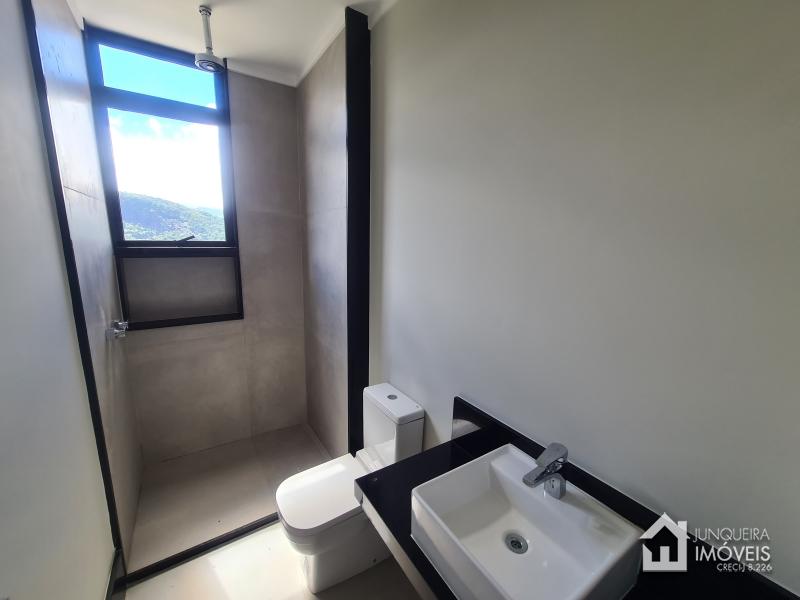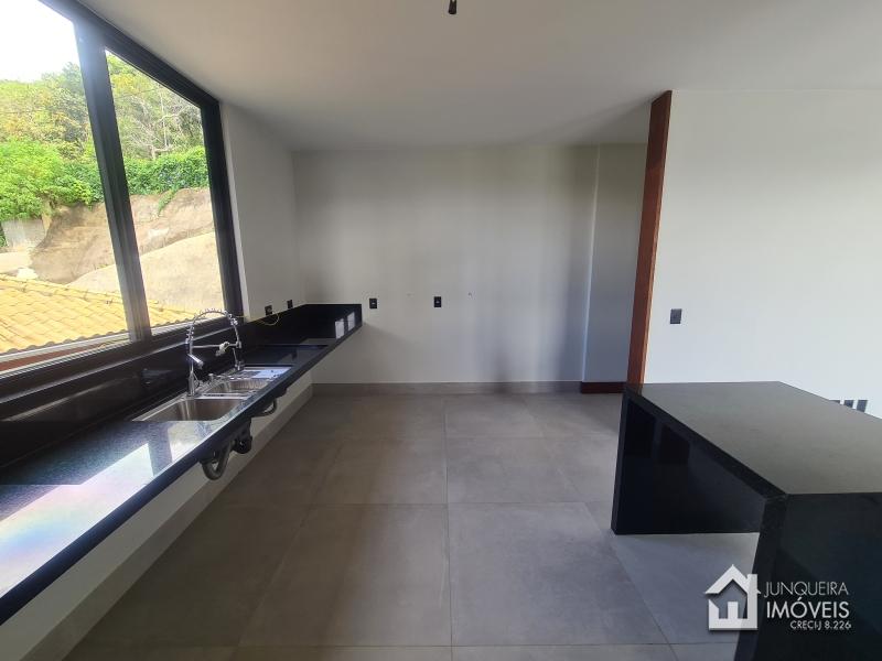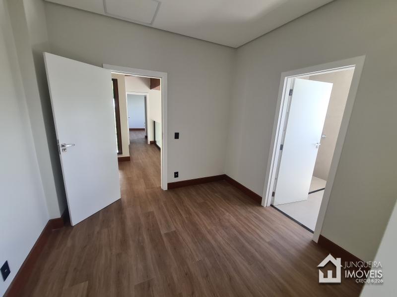 Composta de sala em 3 ambientes com pé direito de 6 metros de altura, cozinha americana, lavabo, lavanderia e banheiro de serviço. Três suítes sendo uma no pavimento térreo e outras duas no pavimento superior. Todas com espaço para o closet.