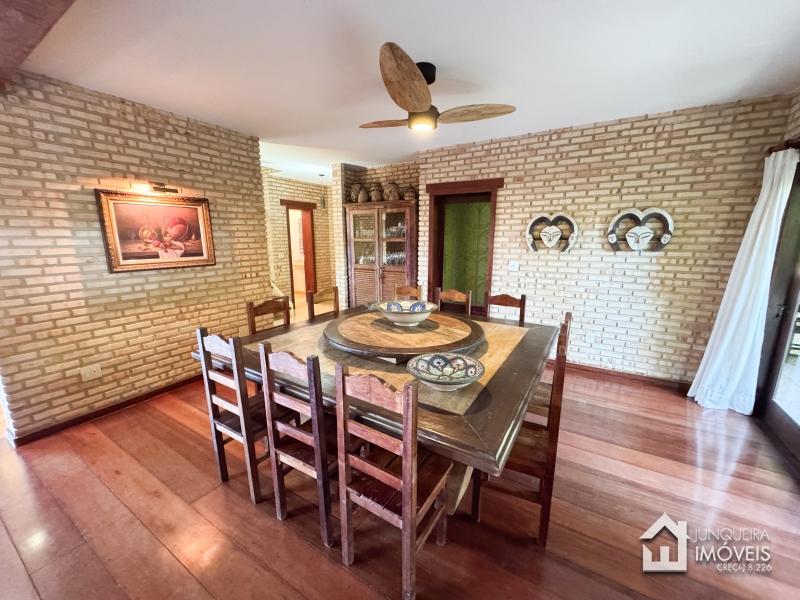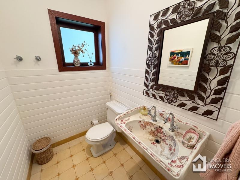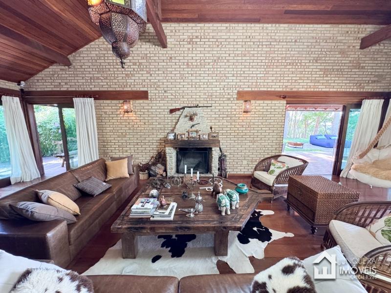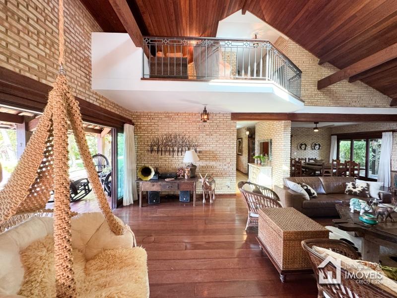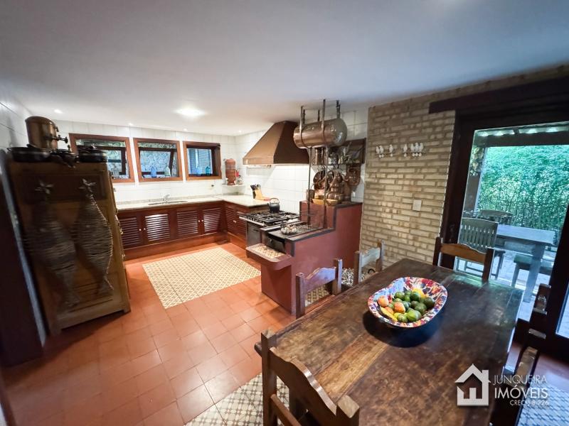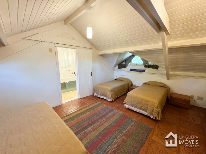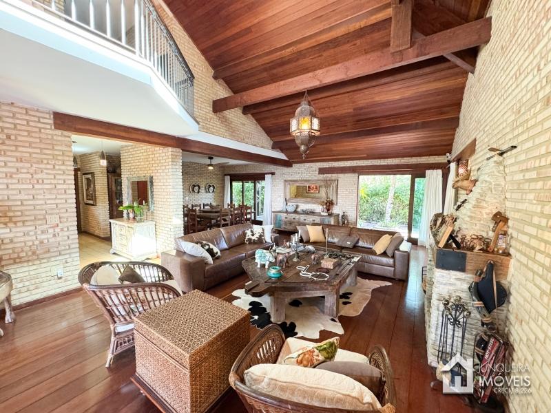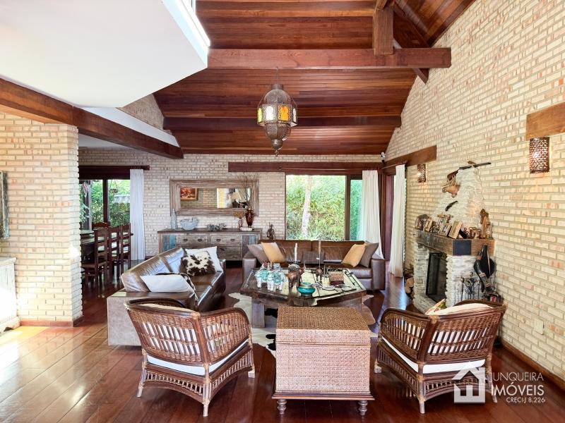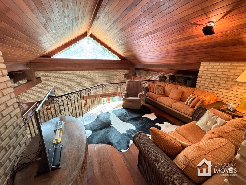 A casa tem cerca de 500 m2 de construção e conta com hall de entrada, lavabo, sala em 2 ambientes com pé direito elevado e lareira central, sala de jantar, copa/cozinha com despensa, lavanderia e dependência completa. Conta, no andar superior, com 3 suítes, todas com sacada, além de mezanino com sala de TV. No último andar temos um sótão habitável com sala e mais uma confortável suíte.