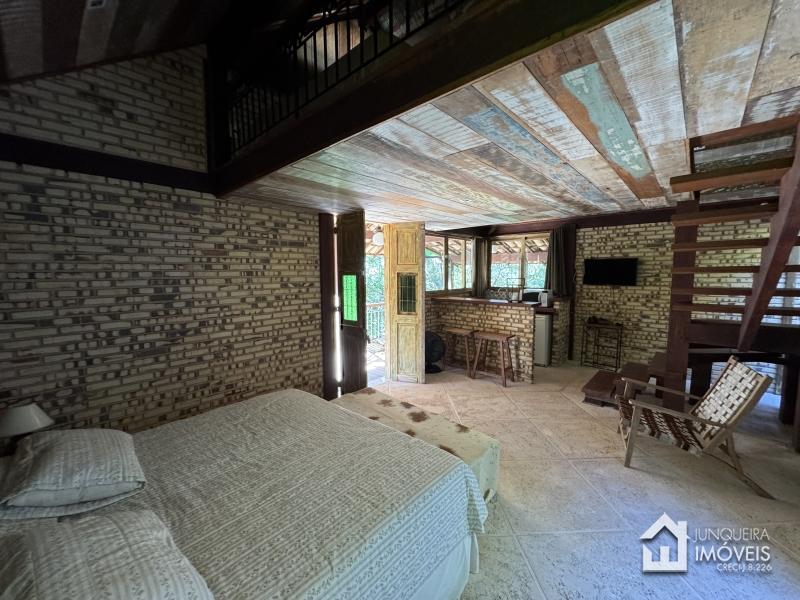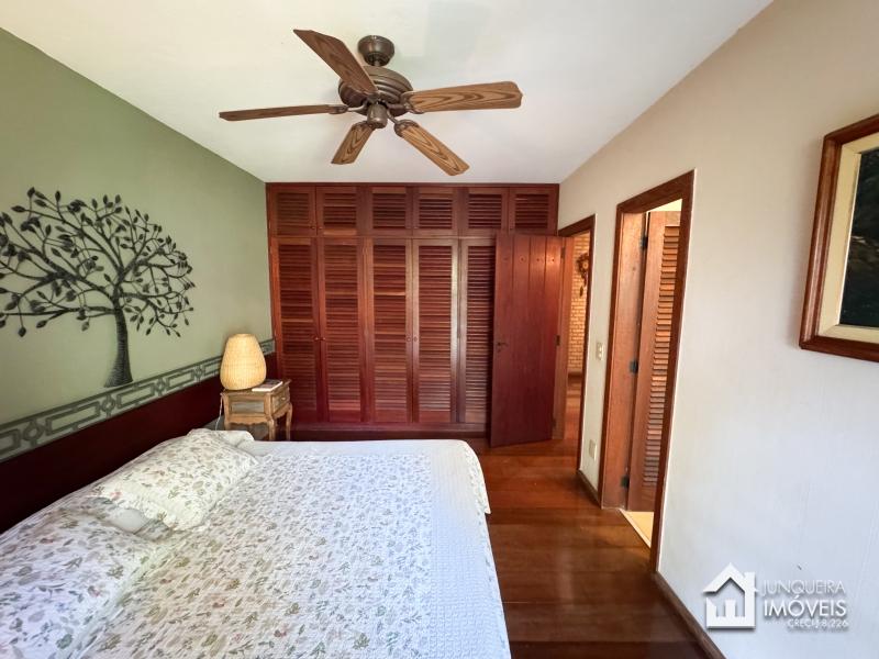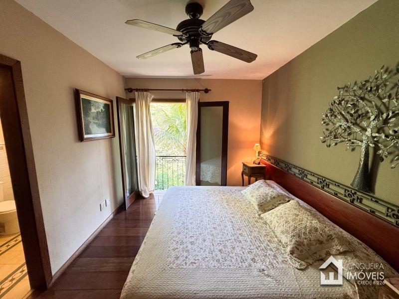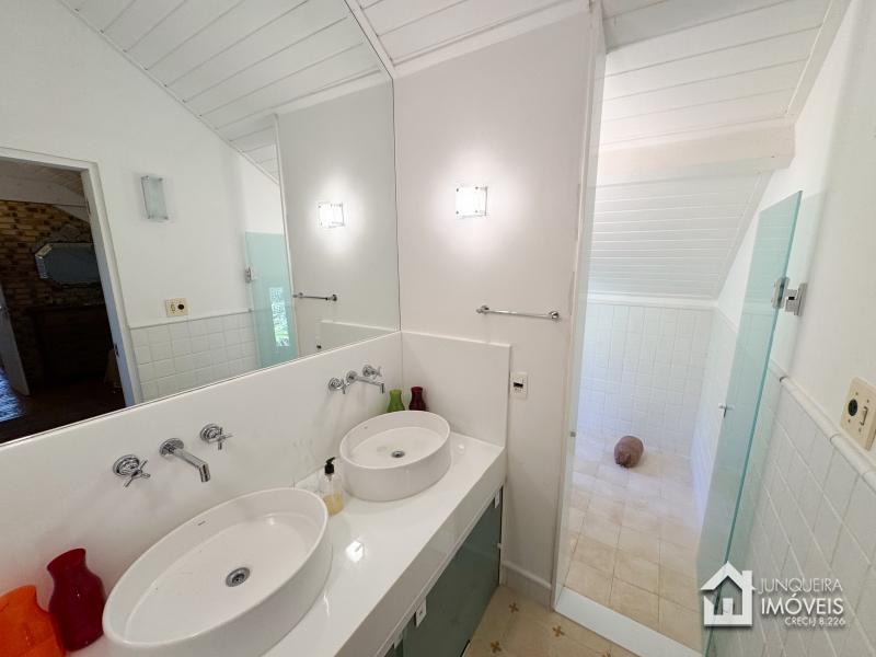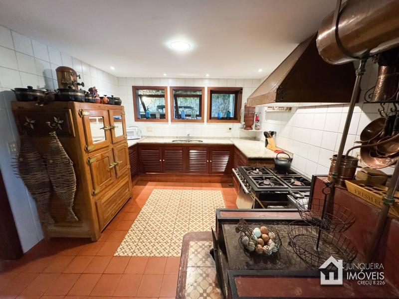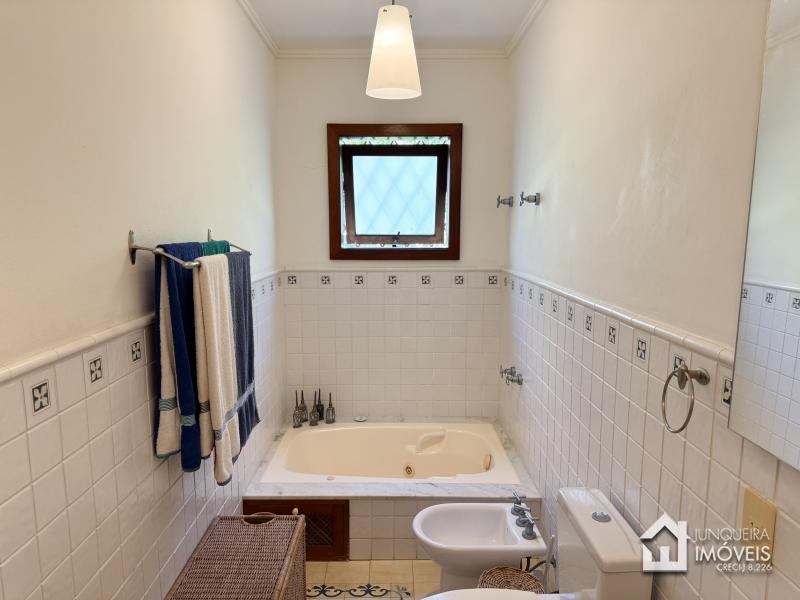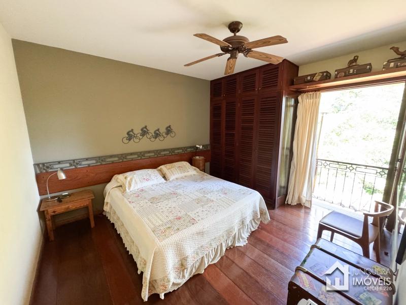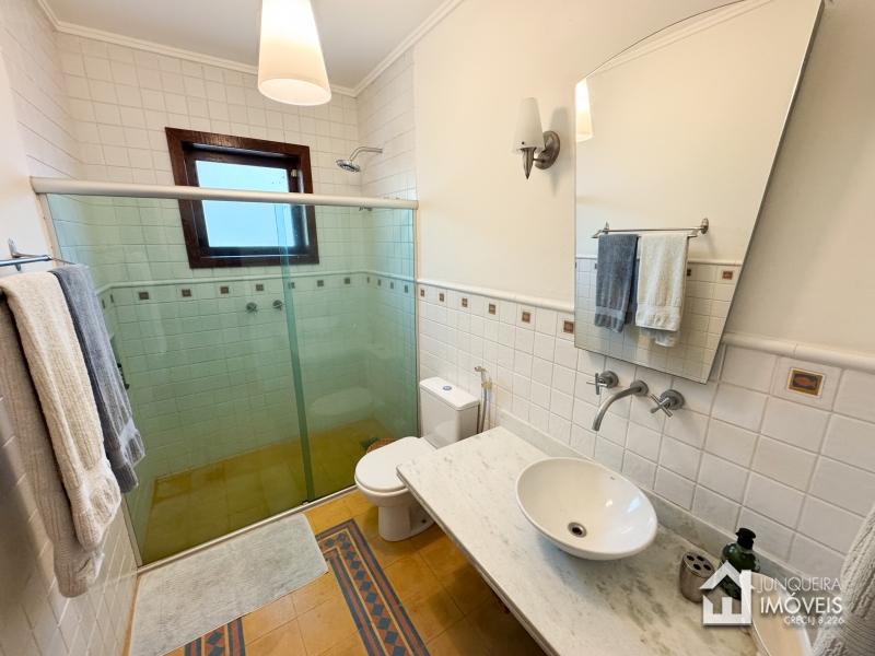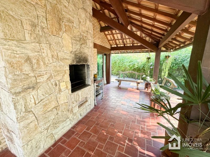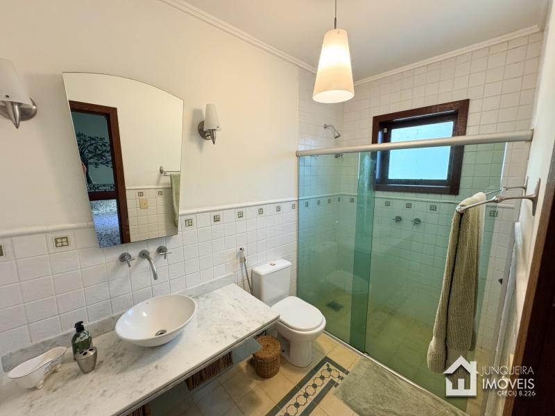 A casa tem cerca de 500 m2 de construção e conta com hall de entrada, lavabo, sala em 2 ambientes com pé direito elevado e lareira central, sala de jantar, copa/cozinha com despensa, lavanderia e dependência completa. Conta, no andar superior, com 3 suítes, todas com sacada, além de mezanino com sala de TV. No último andar temos um sótão habitável com sala e mais uma confortável suíte.