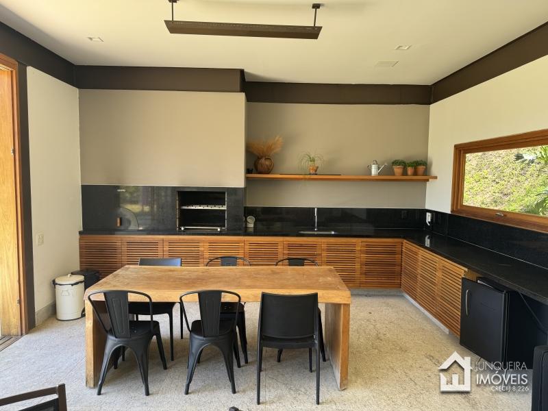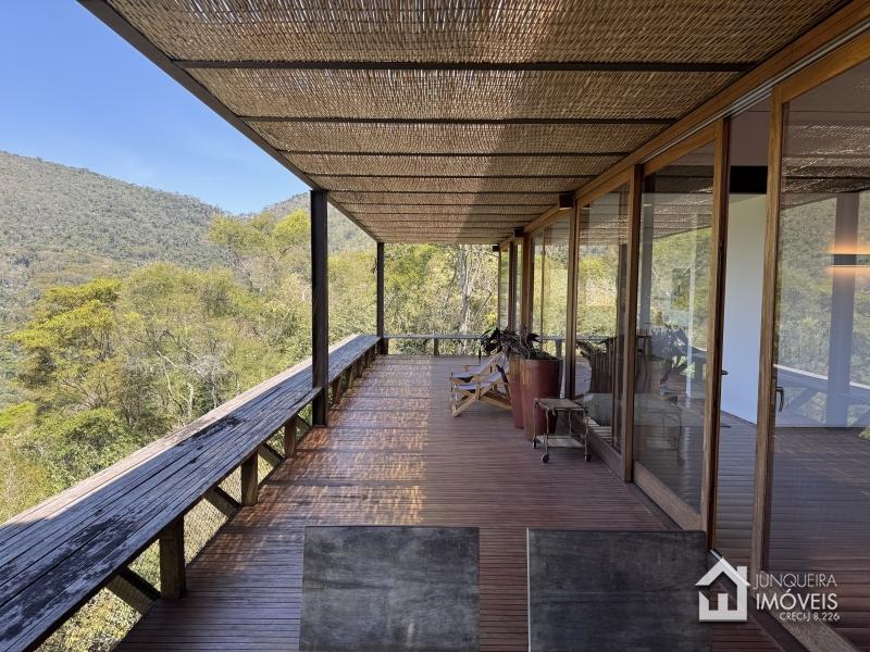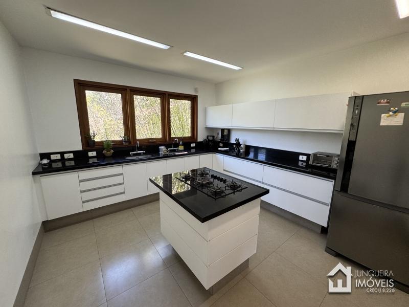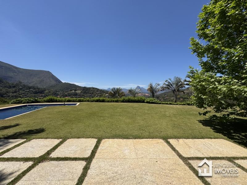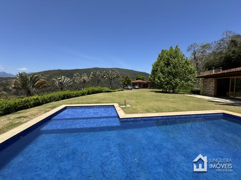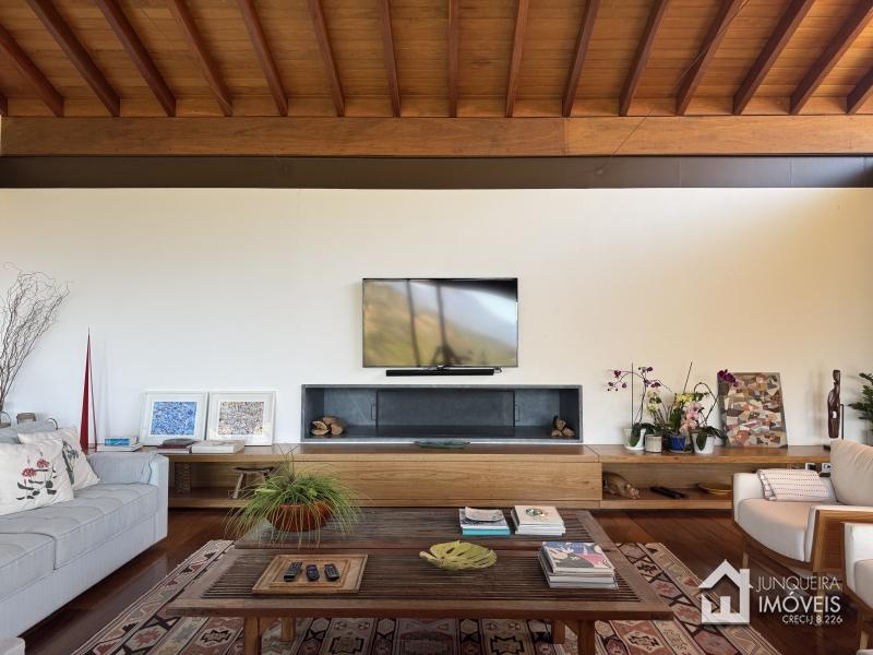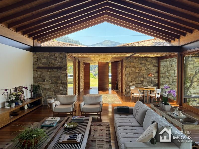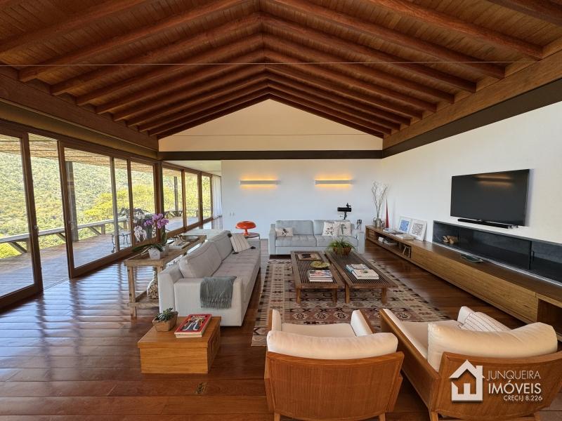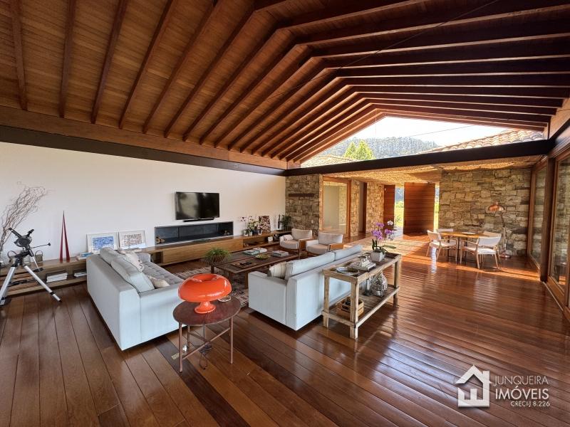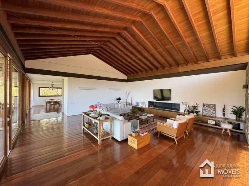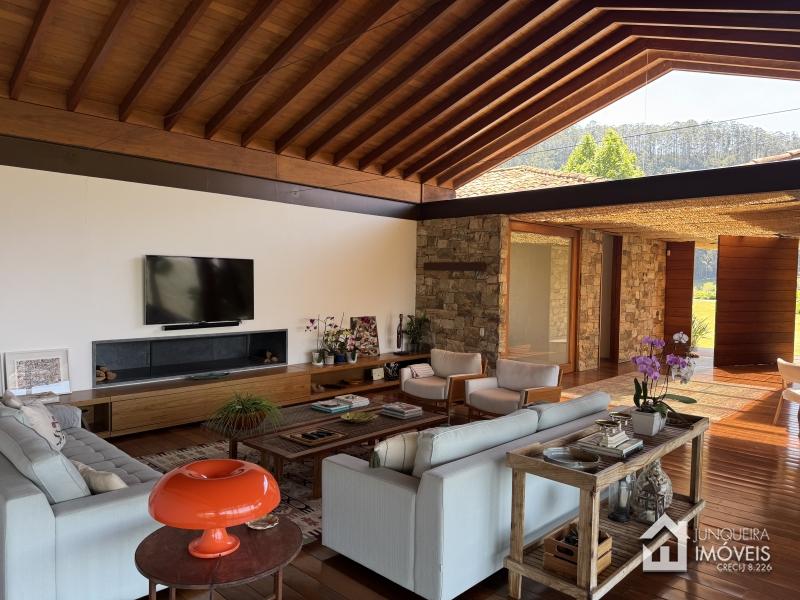 Implantada em terreno plano, a casa desfruta de vista permanente para as montanhas, paisagismo exuberante com jardins amplos e gramado cuidadosamente preservado, criando um cenário de rara elegância.