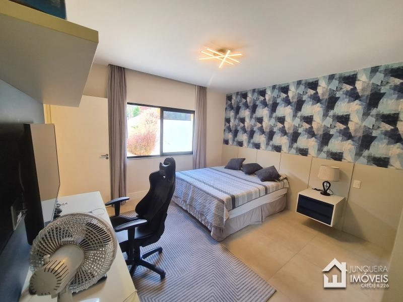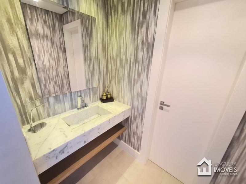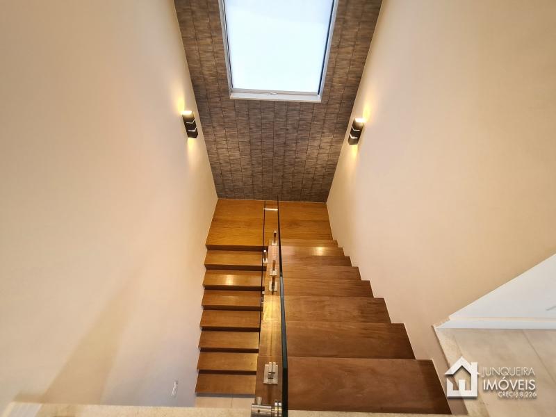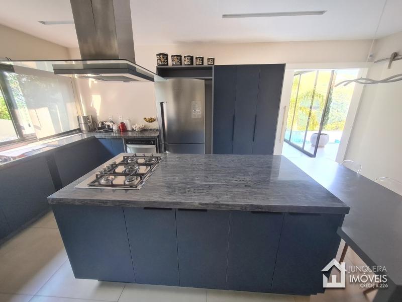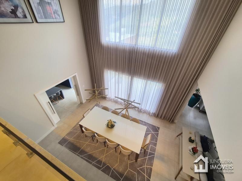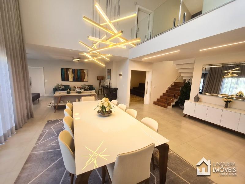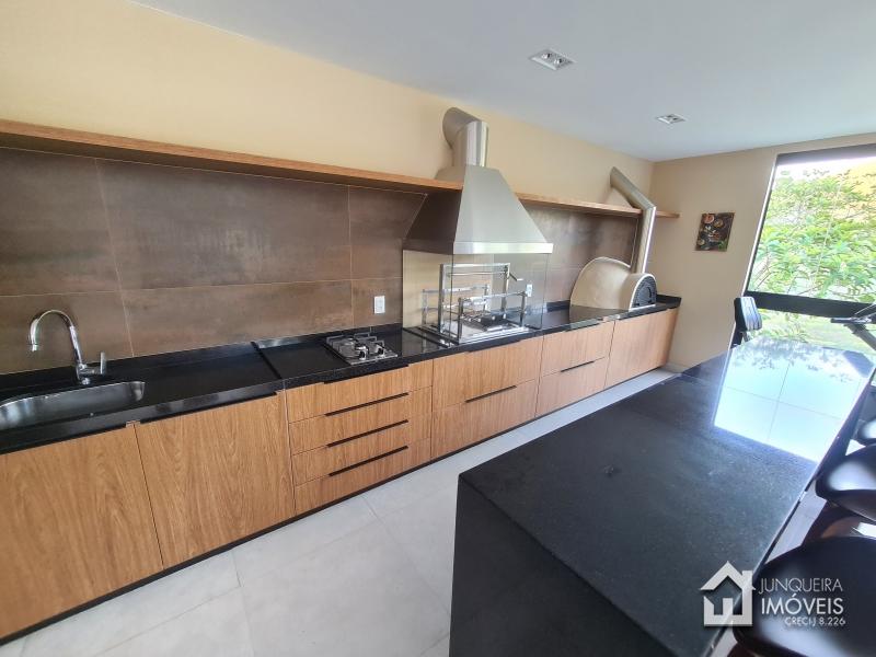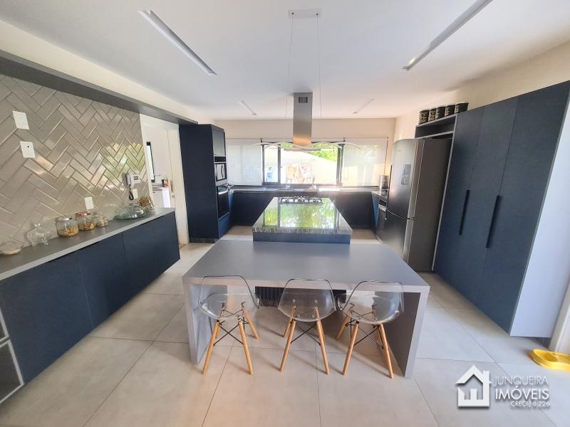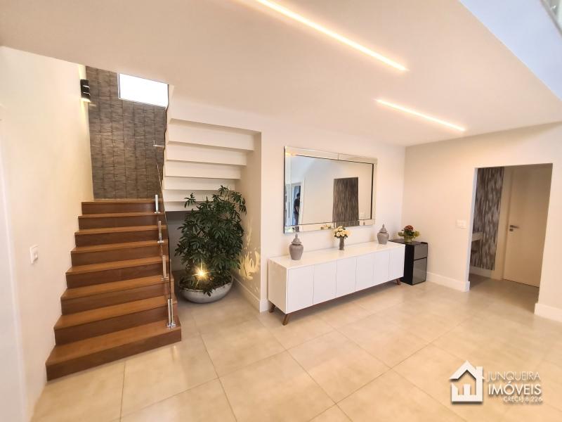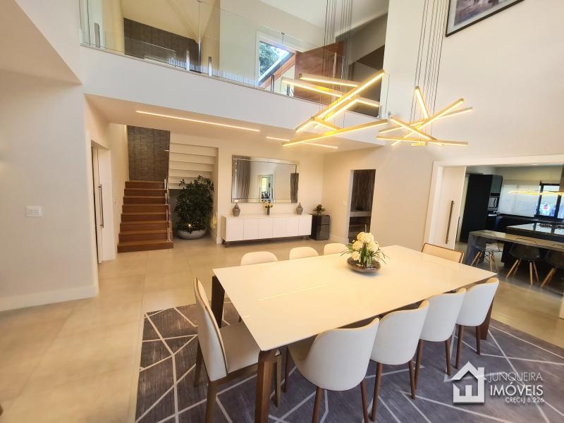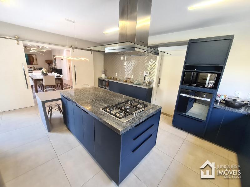 Composta de hall de entrada e mezanino com vista para sala de jantar com pé direito duplo, sala de estar com lareira a gás, sala de TV, salão de jogos e lavabo, tudo muito bem integrado com a cozinha planejada com armários Dalmobille e ilha, além de uma excelente área gourmet com churrasqueira, forno de pizza e cozinha de apoio. Conta ainda com dependência completa.