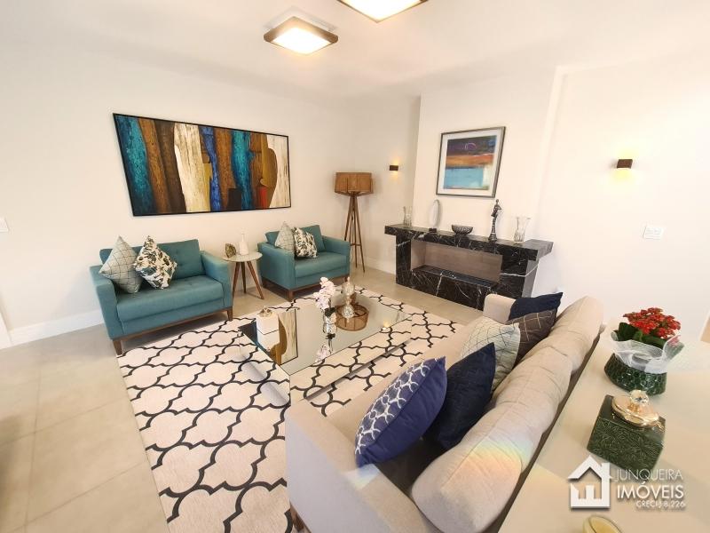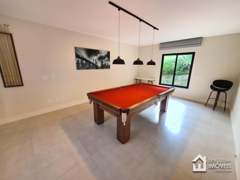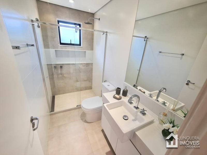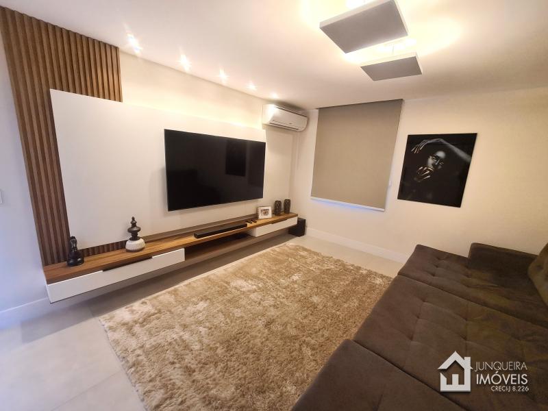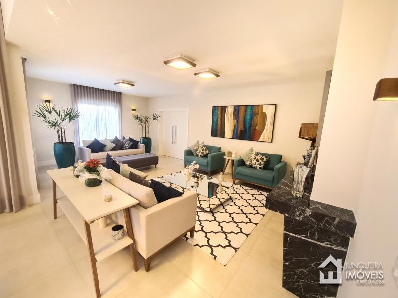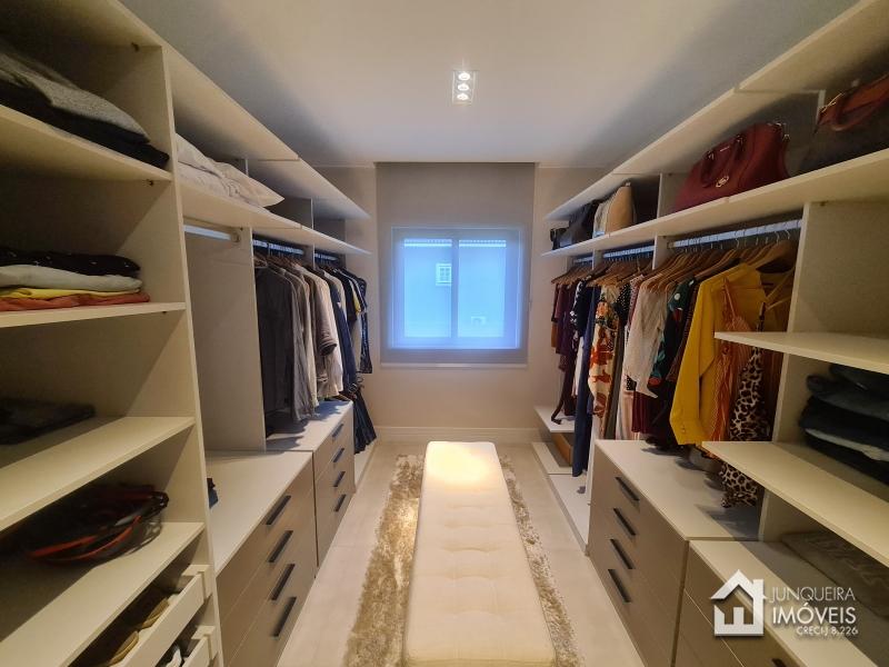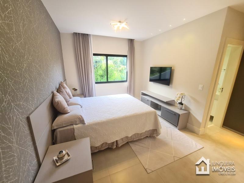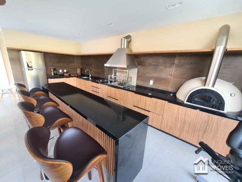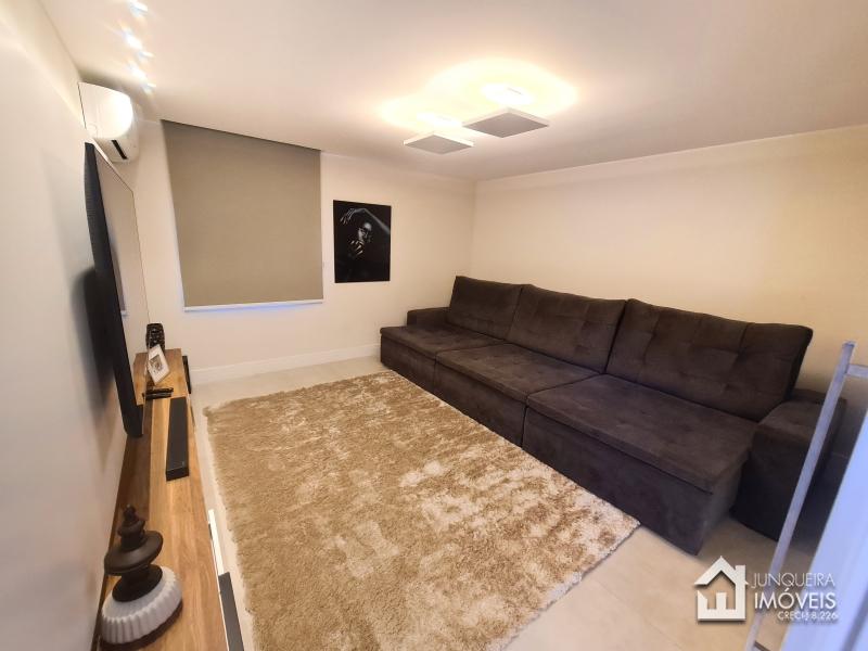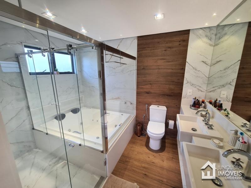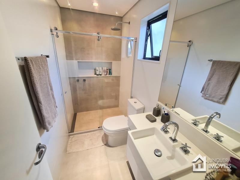 Composta de hall de entrada e mezanino com vista para sala de jantar com pé direito duplo, sala de estar com lareira a gás, sala de TV, salão de jogos e lavabo, tudo muito bem integrado com a cozinha planejada com armários Dalmobille e ilha, além de uma excelente área gourmet com churrasqueira, forno de pizza e cozinha de apoio. Conta ainda com dependência completa.